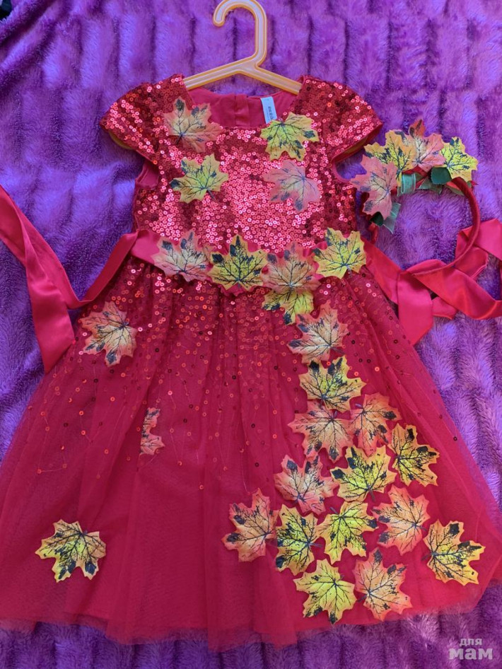 4. Продано! Платье Акула, красное с паетками. Украшено на праздник осени, листья можно снять. Б/у, состояние отличное. Размер 116, цена 1000р