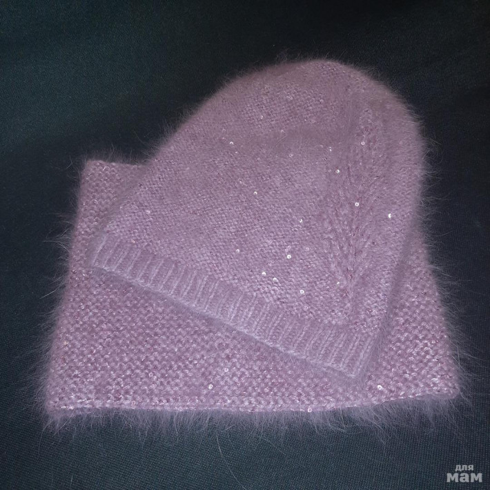 Зимний комплект ручной работы из длинноворсового пуха норки с микропайетками в тон пряжи: шапочка-бини "Перышко" + снуд.