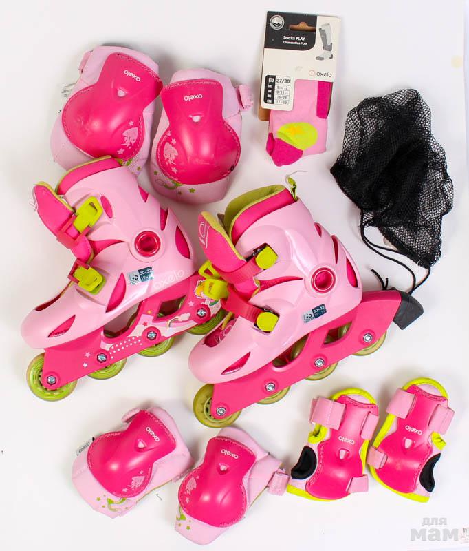 В комплект входит: Ролики. Защита на колени, локти, кисти, новые носки под цвет комплекта. Сумочка - сеточка для защиты
