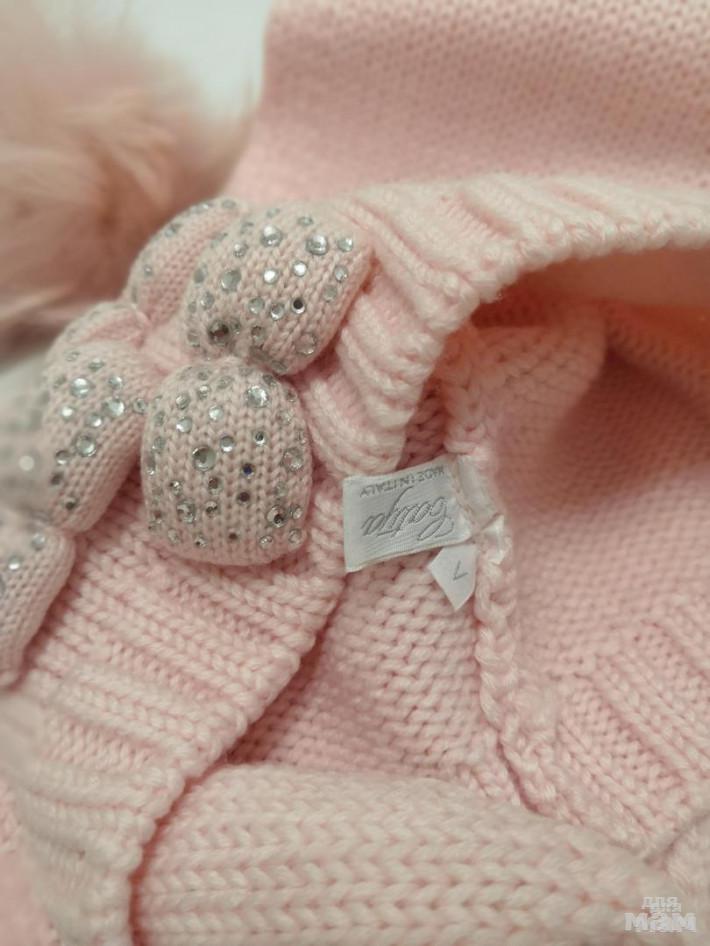 итальянский комплект , состояние нового,нюансов нет,размер 5 подойдёт и на малышку и на по старше,практически на любой о.г.если шапка большая ,то можно помпон завязать так,чтобы собрать лишнее на макушке,у шапочки есть завязки,большой,пушистый пумпон, на фото с пакета ещё примятый, куплен отдельно за 1500,новый на завязках