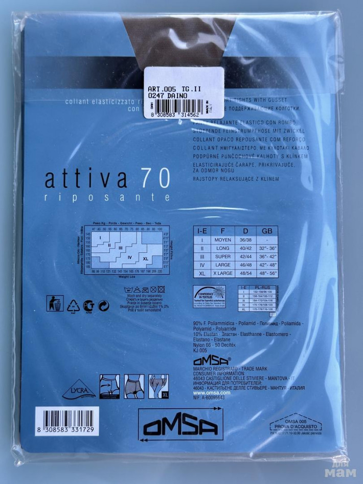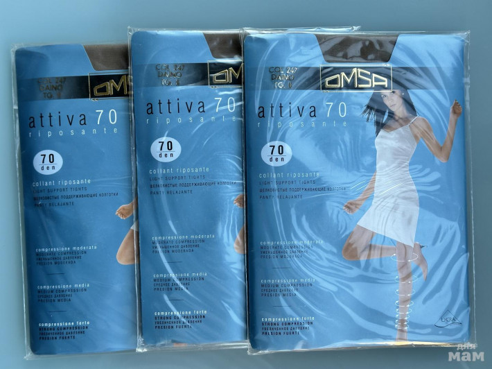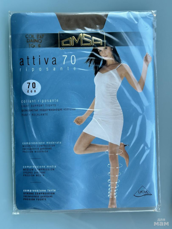 1) Omsa Attiva : Плотные шелковистые колготки с лайкрой, 70 ден, с распределенным давлением, формованные, с ластовицей и усиленным носком. Состав: полиамид 90%, эластан 10%