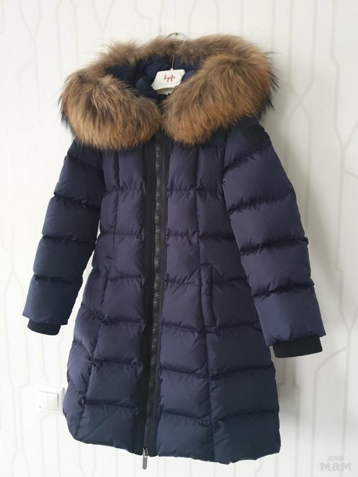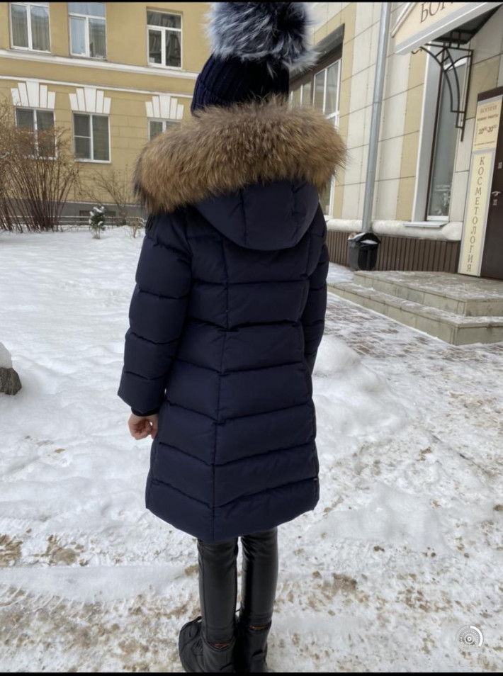 В рукавах трикотажные манжеты . Большой капюшон , густой мех .