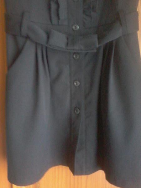 Сарафан из костюмной ткани с небольшим рукавчиком, застёжкой снизу до верха и карманами.