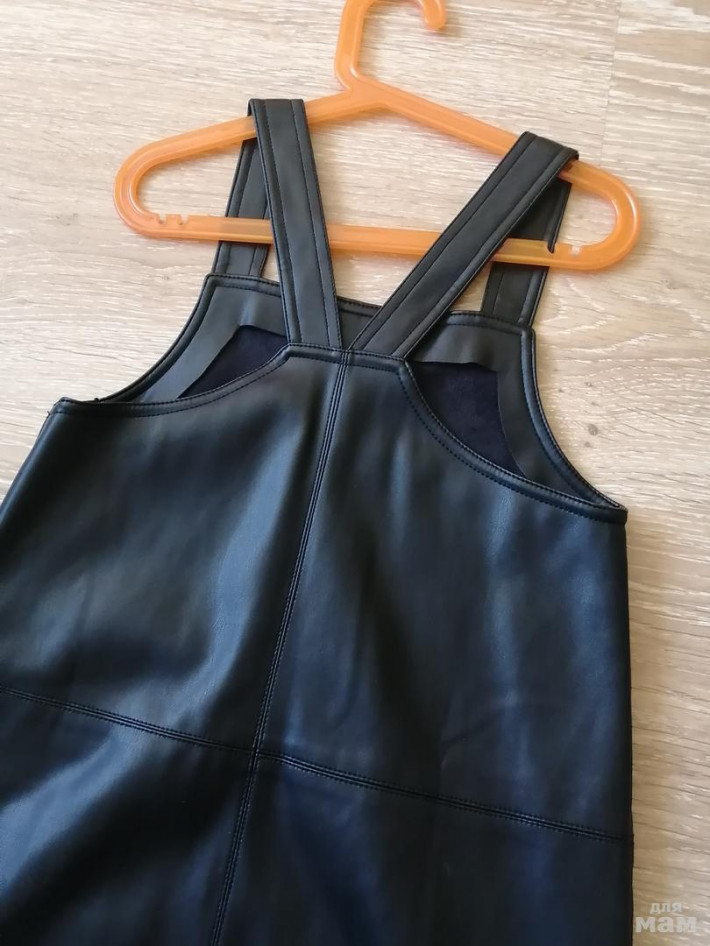 Сарафан из мягкой искусственной кожи Mango Kids. Цвет чёрный. Размер 128, можно начинать носить от 120см. Длина лямок не регулируется. Подойдет на девочек среднего телосложения, так как не узкий. Качество отличное, швы ровные, торчащих ниток нет. Состояние отличное. Можно носить и на повседневку, с лонгсливом, и на выход, с красивой блузкой или рубашкой.