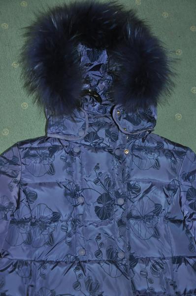 Красивенное зимнее пуховое пальто насыщенного сине-фиолетового цвета с набивкой "бархатные цветы", мех крашенный в цвет песец. на 12 лет ( 152). Б.у. состояние отличное. Капюшон застегивается и хорошо закрывает горло, можно без шарфов. С завышенной линией талии.