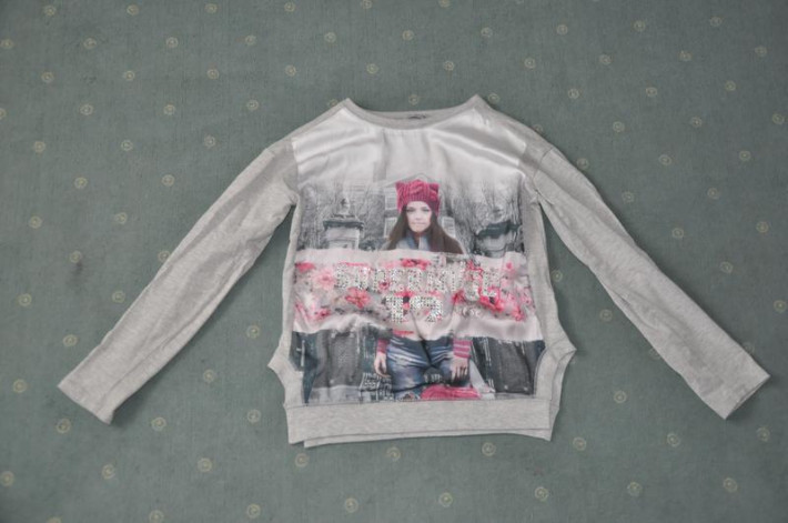 Размер 152, маломерка. На 146 хорошо. Передняя часть- искуственный шелк.