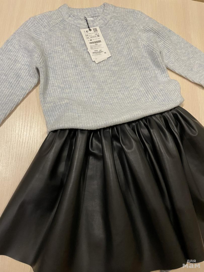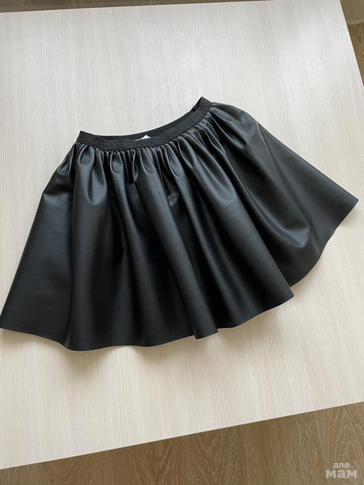 Юбочка из искусственной кожи H&M. Цвет чёрный. Есть трикотажная хлопковая подкладка. Размер 122-128. Соответствует размеру. Но можно начинать носить и раньше. Подойдёт для девочек с животиком, плотного телосложения, так как резинка на талии достаточно широкая и никак не регулируется. С худых девочек сваливается. В отличном состоянии. Но есть один нюанс: изначально это была юбка с плиссировкой(в складочку), но складки были не равномерными и я ее отпарила и убрала все складки. Так она смотрится получше. На фото, для примера показала, вариант сочетания юбки с джемпером.