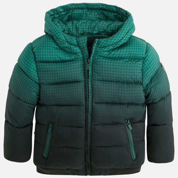 Внешняя мягкая плащевая ткань с градиентом от однотонного темно-зеленого до сочно-зеленого с принтом. Подкладка флисовая. Низ и рукава на трикотажной манжете.