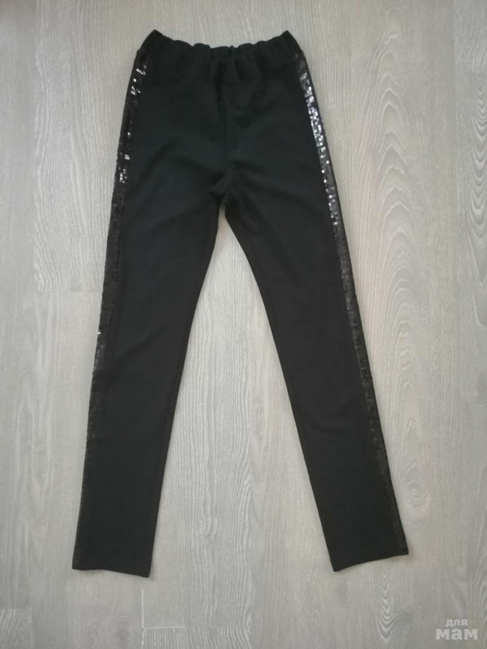 Новые, но ценник срезан. Украшены лампасами из пайеток. Ткань шикарная, плотная, немного со стрейчем. Из школьной коллекции. Цвет черный.