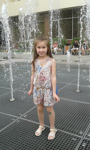 Отличного качества красивый и лёгкий летний комбинезон для девочки на 6-8 лет, хороший вариант на жару, в хорошем состоянии (б/у раза 3-4, но по ткани видно что не новый, присутствует незначительный износ). На некоторых фото дочке 5,5 лет , а на некоторых 7,5 лет.