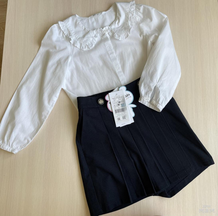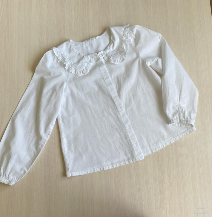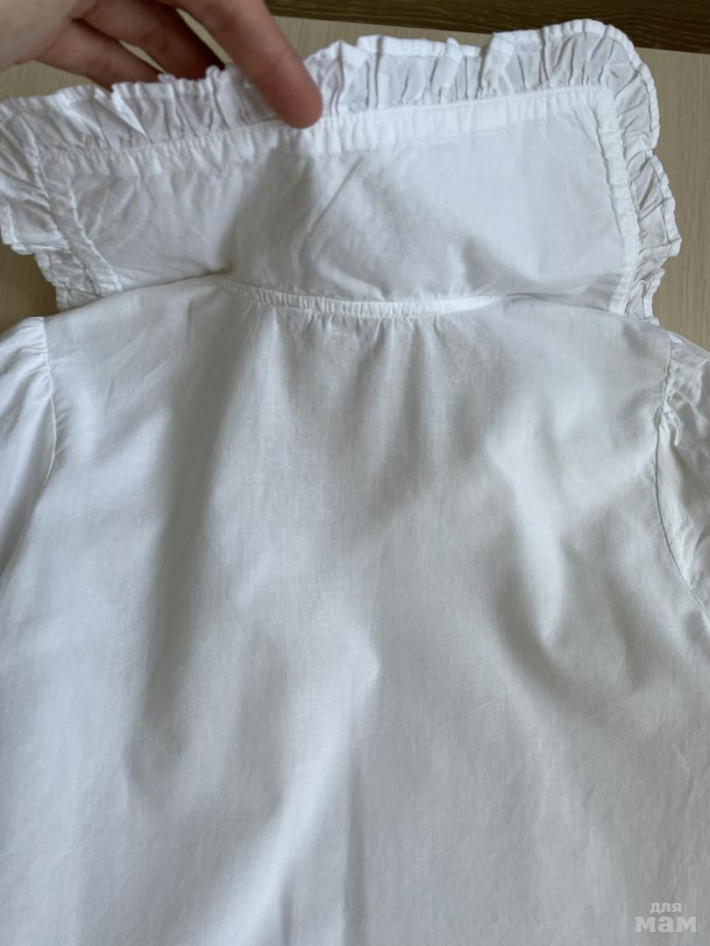 Блузка из 100% хлопка, с очень красивым воротничком. Размер 134, идет на рост 128-134, а девочкам не худеньким, более плотного телосложения, можно начинать носить и от 125см. Материал легкий, тоненький, совсем не жарко будет в школе. Подойдёт под любой низ: брючки, юбочки, сарафан. В отличном состоянии. Без дефектов. Замеры смотрите на фото.