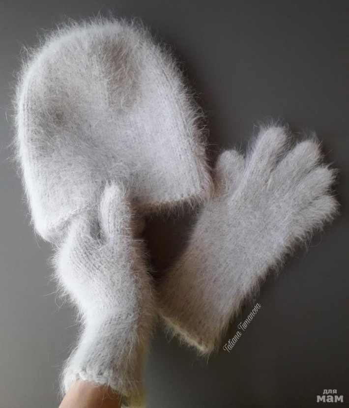 В наличии комплект шапочка и перчатки из ангоры в светло-сером цвете.