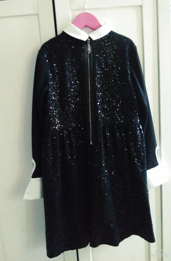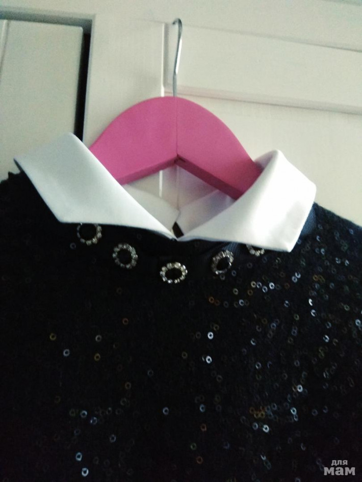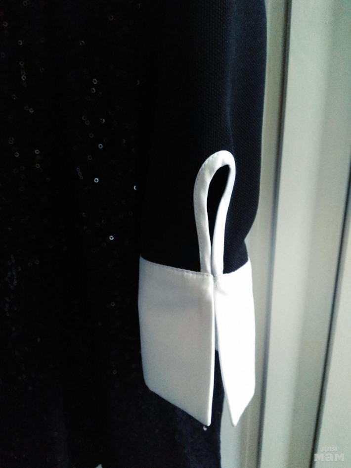 Цвет чёрный, отрезное под грудью, само платье в пайетках, рукава - без, на подкладке.