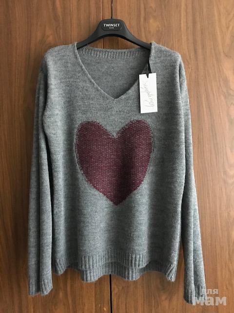 Очень стильный свитер (джемпер) от нишевого бренда Simphony подбренд итальянской компании одежды Vanilla. Италия. Коллекция осень-зима. Абсолютно новый, с этикеткой. Спокойный серый цвет, аккуратный V-образный вырез, на переднем плане интересный акцент: вышитое сердце. Спинка свитера однотонная. По краю рукавов и нижнему краю идёт трикотажная резинка. Перед свитера чуть укорочен, что позволяет его чуть заправлять и носить с лёгким напуском, либо носить в обычном, классическом варианте. Хороший состав: 75%- акрил, 10%- натуральная шерсть, 10%- вискоза, 5%- альпака. Достаточно тёплый и приятный к телу. Размер: итальянский TU- единый размер, прекрасно сядет и на русский 42 (но будет немного свободным, хотя это кто как любит), обычный 44, и на 46. Для вашего удобства замеры: длина от середины плечевого шва до нижнего края: 64 см, расстояние от левого до правого плечевого шва: 46 см (линия плеч опущена), расстояние о подмышки до подмышки: 52 см, ширина по талии от шва до шва: 48 см, ширина по нижнему краю: 54 см, длина рукава: 60 см. Интересная модель, которая прекрасно подружится и с любой белой футболкой, и с белой рубашкой, и с бельевым топом с кружевным низом, с джинсами или хлопковыми брюками.