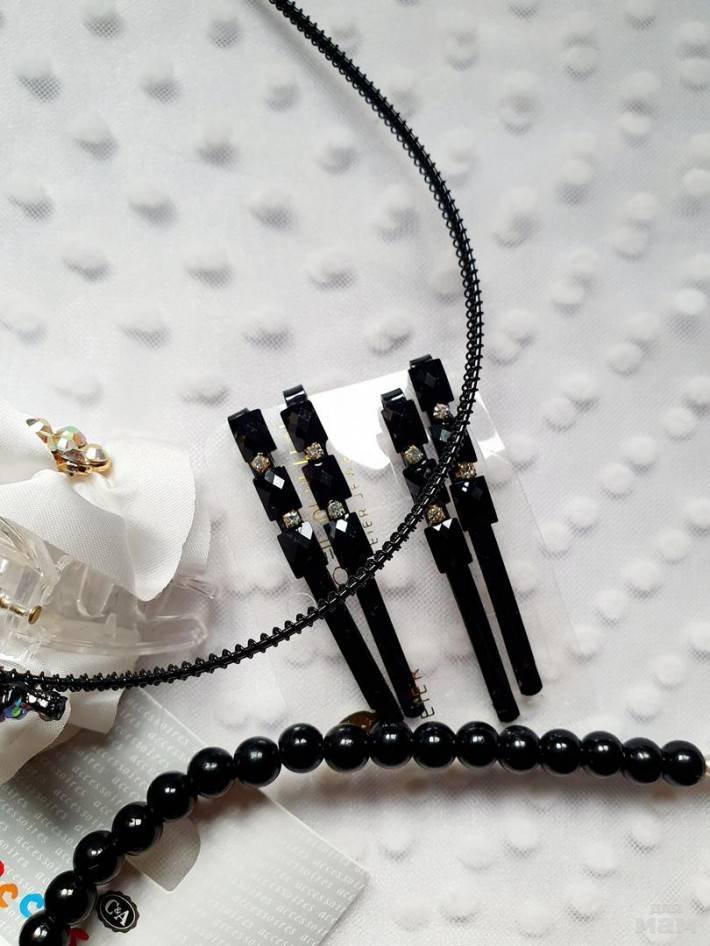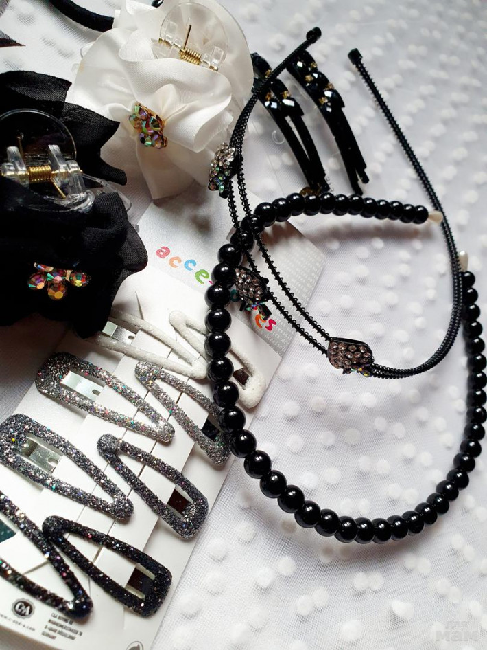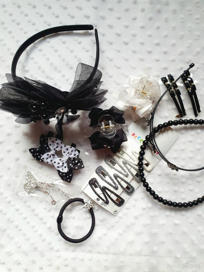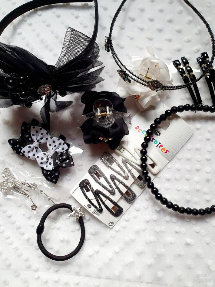 Черно-белый набор резинок и заколок для волос в подарочной коробочке.
