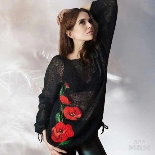 Декорирована яркими маками в технике фелтинга (шерстяная акварель). Рисунок очень прочно держится на полотне и никогда не отвалится👌