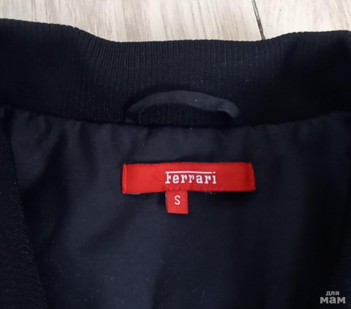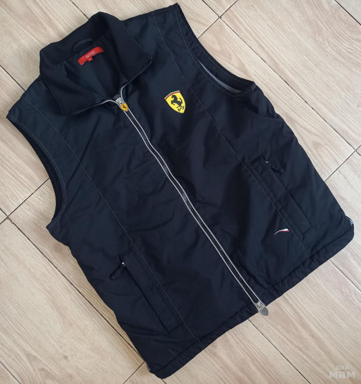 НОВЫЙ стильный жилет FERRARI ОРИГИНАЛ р.S (на рост 158-164, р.44-46). Чёрного цвета, на молнии спереди, фурнитура брендированная, два прорезных кармана на молниях, утеплён внутри флисом серого цвета, воротник изнутри - трикотажная резинка. Два внутренних кармана с выходом для гарнитуры. Куплен за 9600, бирки сняли, но носить ребёнок категорически отказался