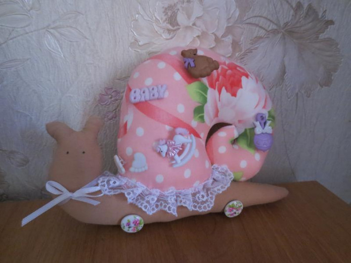 улитка, одна выполнена в нежных розовых цветах с символами для новорожденной девочки (приятный подарок молодым родителям), с которым сможет играть и сам ребенок. Вторая - просто романтичная улитка украсит интерьер любого дома.