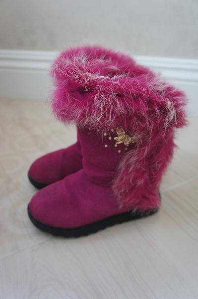 Очень красивые сапожки Капитошка, яркий цвет фуксия, натуральная замша, внутри толстый натуральный мех, очень теплые, подошва не скользит) Настолько удачные, что на будущую зиму взяла такие же..бабочка и стразики красиво переливаются..
