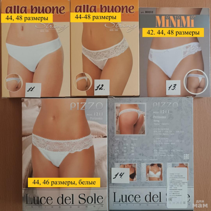 Все трусики и стринги новые в упаковке (коробка). Размеры от 42 до 52.