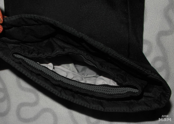 Брючины со снегозащитными муфтами, препятствующими для проникновения снега внутрь.