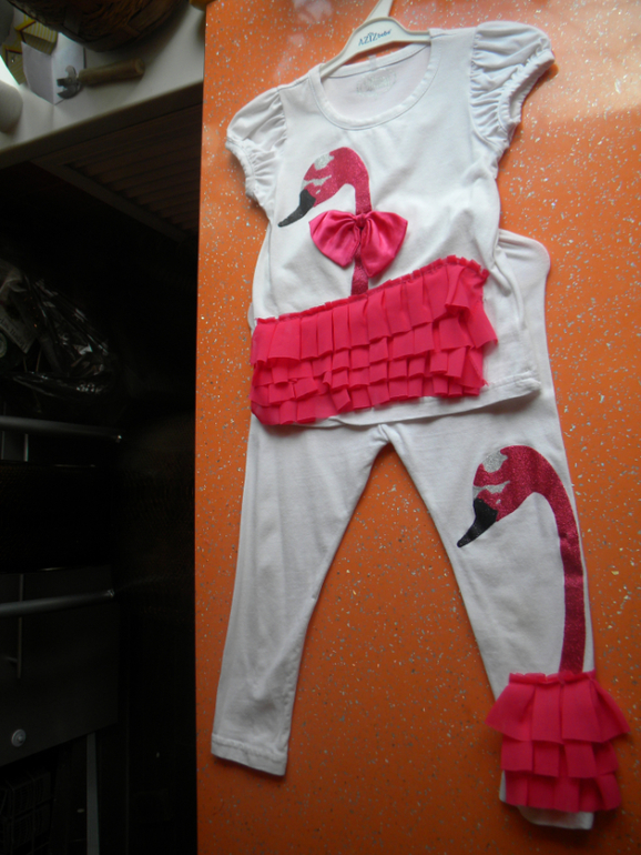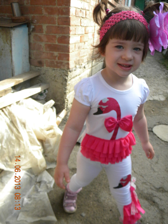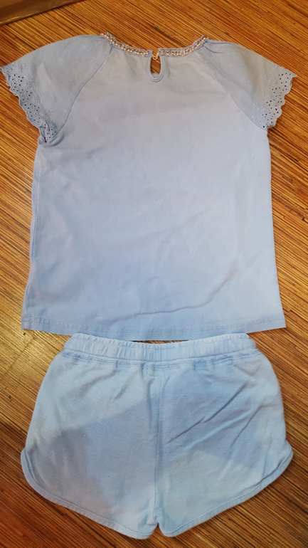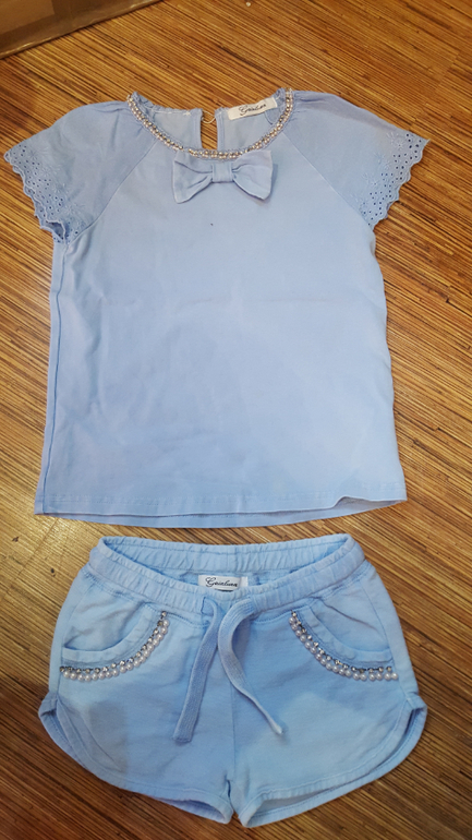 3. Комплект шорты+майка Gaialuna, размер 110см. Цвет ,как на первом фото, светло-голубой. По горловине и кармашкам- стразы и жемчуг. Очень нарядный комплект! Состояние : майка - отличное, шорты сзади чуть зацепки, смотрите нижнее фото. Цена комплекта 1300руб. ( покупала за 2900руб.по старому курсу)