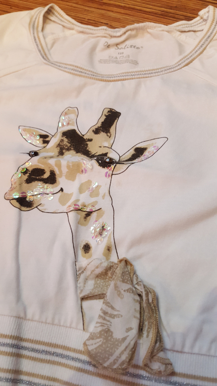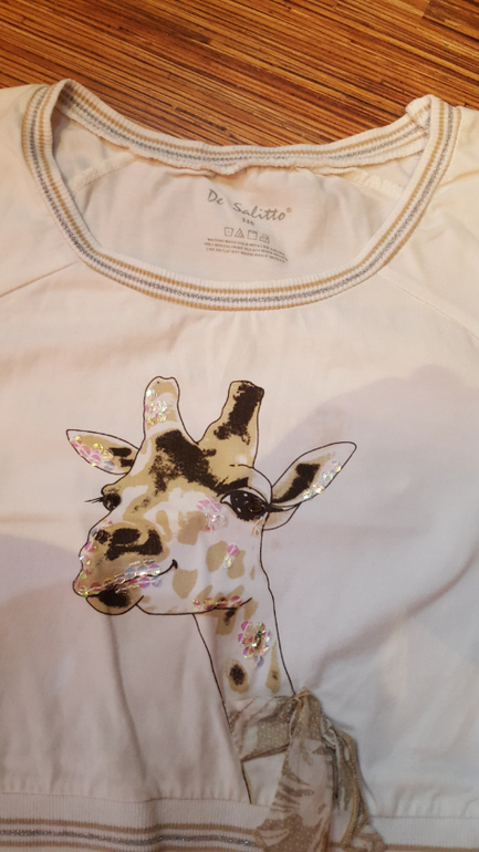 18.Майка De Salitto, состояние отличное,размер 110см, укороченная моделька, чуть ниже талии. Жираф в пайетках, шарф у жирафа на шее - шифон, качество - тонкий трикотаж. Пояс,горловина и рукава внизу - вязка- резинка ХБ, с серебряными полосками из люрекса. Очень красивая и необычная майка)) Цена 450руб.