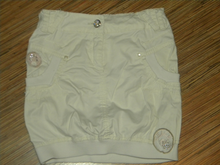 19. Юбка Bullica размер 104см. На талии на пуговке с регулировками. Фасон - типа баллона, внизу- трикотажная резинка.По юбки украшения : стразы, кармашки,клёпки. Цвет молочный. Цена 600руб.