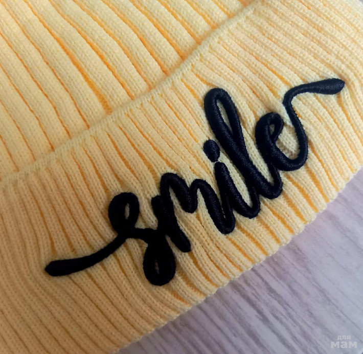НОВАЯ демисезонная шапка бини с отворотом SMAILE р.53-56. Из мягкой шерстяной пряжи вязки лапша светло-жёлтого цвета. Посадка тыковка. Вышитый логотип на отвороте.