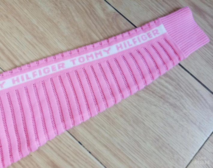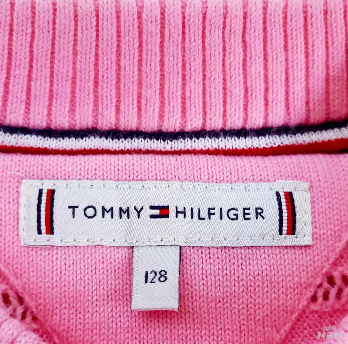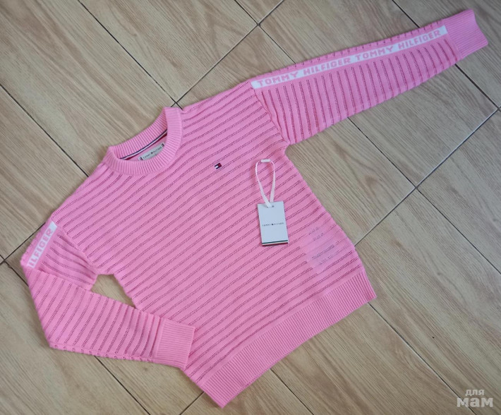 Джемпер TOMMY HILFIGER ОРИГИНАЛ р.128 (128/134). Джемпер ажурной вязки из хлопковой пряжи нежно-розового цвета. На рукавах вывязаны белые лампасы с названием бренда. Логотип бренда на груди.