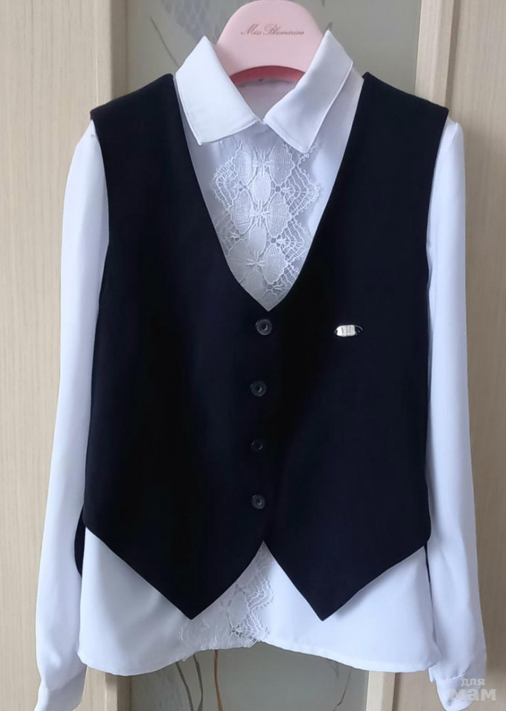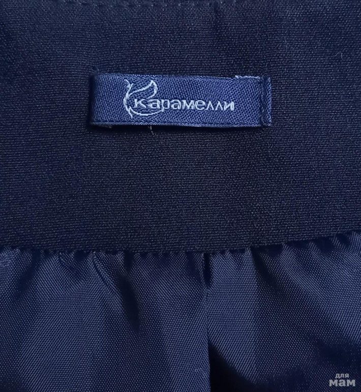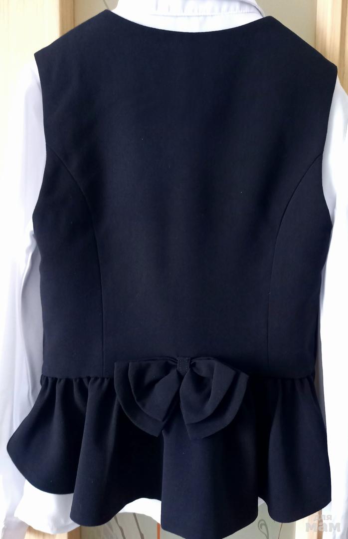 Стильный школьный жилет "Карамелли" р.140. Выполнен из джерси тёмно-синего цвета. Застёжка на 4 пуговицы. Сзади декорирован баской и бантиком. Металлический логотип бренда на груди. Внутри на подкладке.