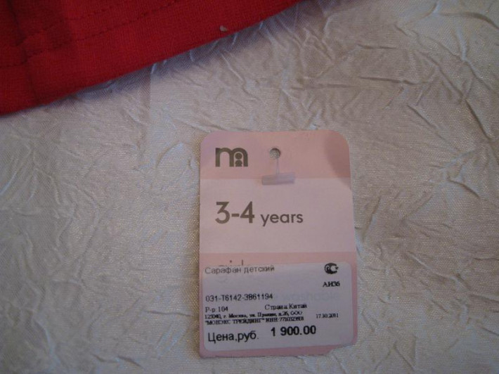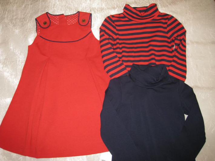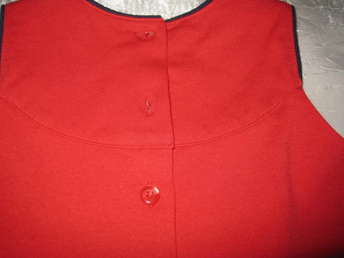 Ярко - красный с синей отделкой. Подкладка на лифе х.б. Трикотаж
