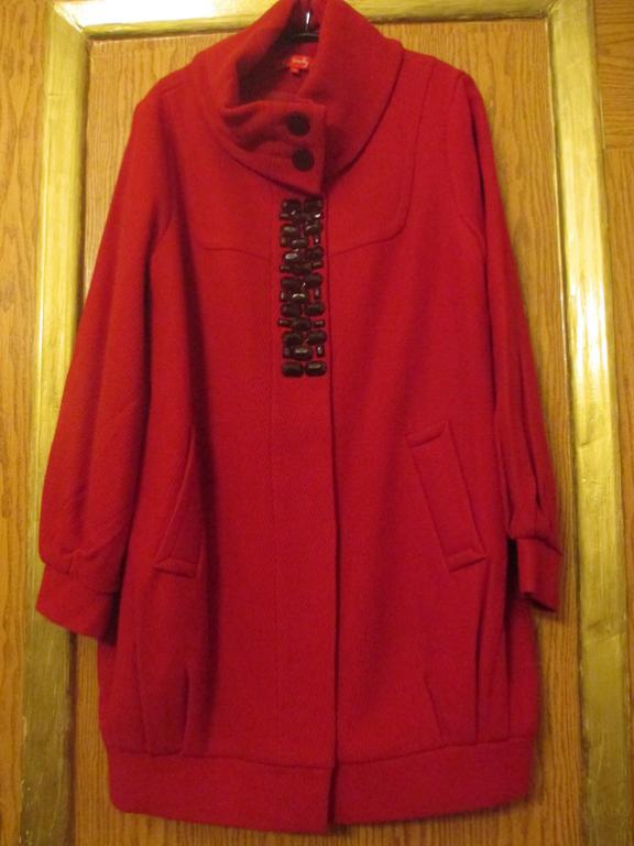 Пальто дорогой французской марки K Derhy. Новое. Цвет красный-винный (ближе на первом фото), спереди расшито черными крупными камнями. Стоило 19990р, купила с 50% скидкой за 10т. продаю за 7000. Состав: 60% шерсть, 20% вискоза, 20% нейлон. Интересный фасон, отлично смотрится и с брюками, и с юбками. Размер М (46-50р).