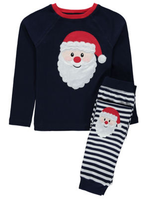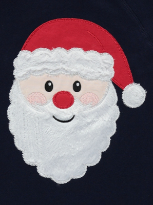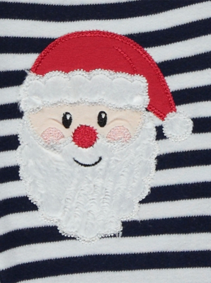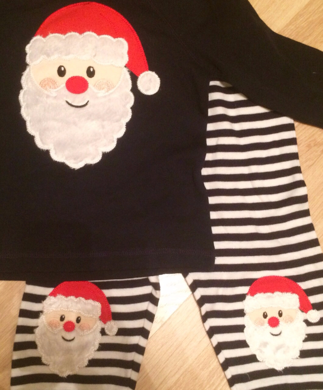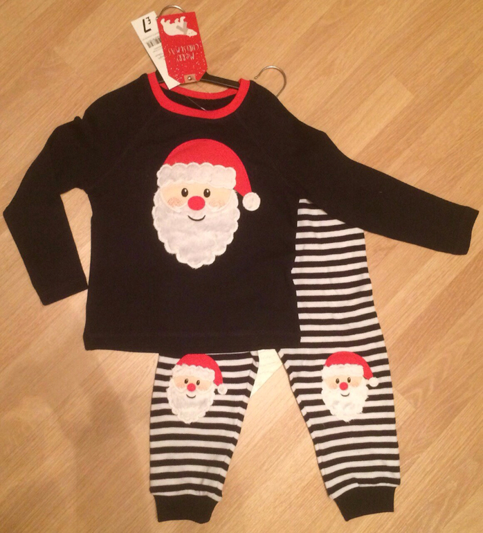 Пижама Новогодняя с длинным рукавом фирмы George. Темно-синяя кофточка с красной отделкой, впереди аппликация Дед Мороз с мягкой пушистой бородой + сине-белые полосатые штанишки с Дедом Морозом на коленках. Дед Мороз мягенький, не будет мешать. Состав 100% хлопок.