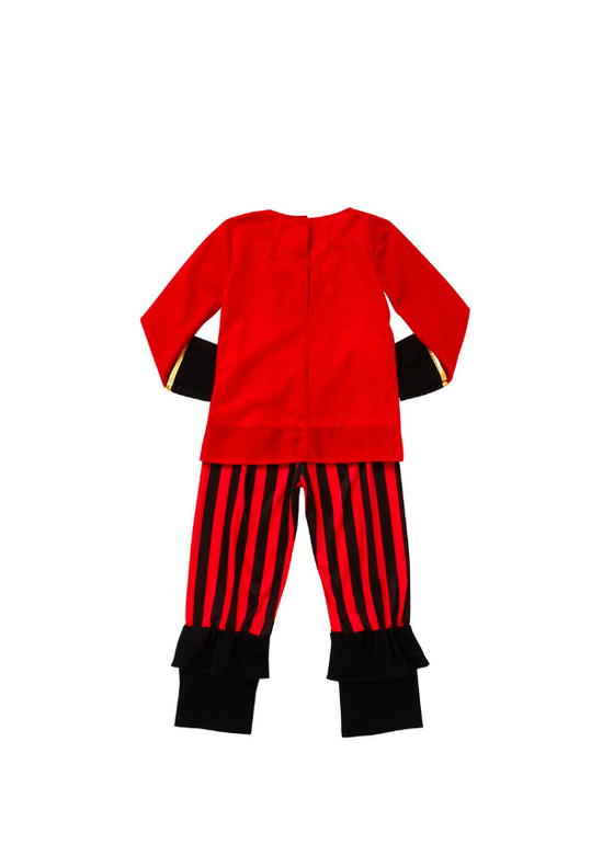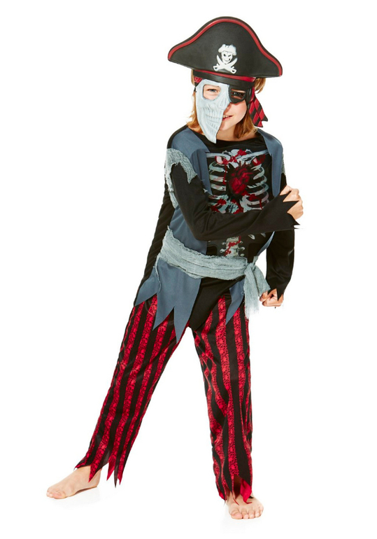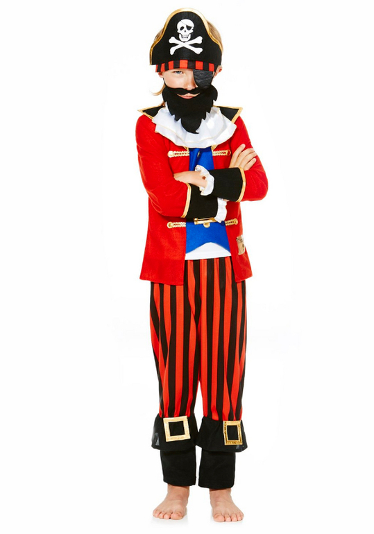 Костюм Пирата фирмы F&F. Кофточка с длинным рукавом, сзади застегивается на липучки, полосатые брюки на резинке в поясе, шляпа с маской из мягкой резины-пластика. Размер 5-6л (110-116), 7-8л (122-128), 9-10л (134-140) 1200руб