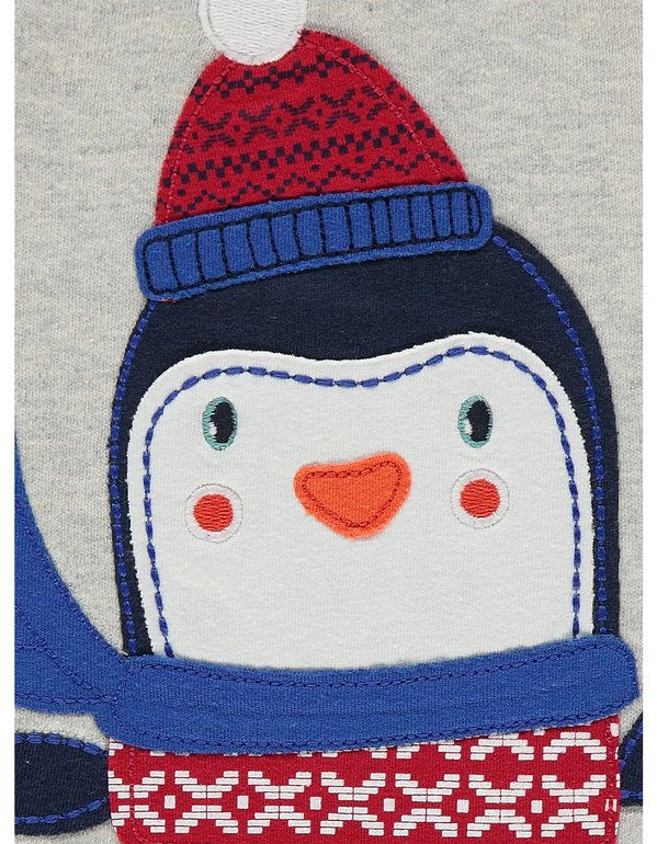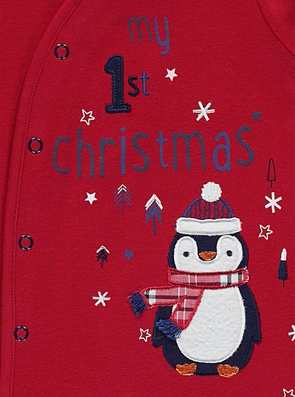 Комбинезончик Новогодний фирмы George. Краснsq, впереди аппликация Пингвин и надпись "Мое первое Рождество", Состав 100% хлопок, размер 0-3мес (56-62), 9-12мес (74-80) 750руб.