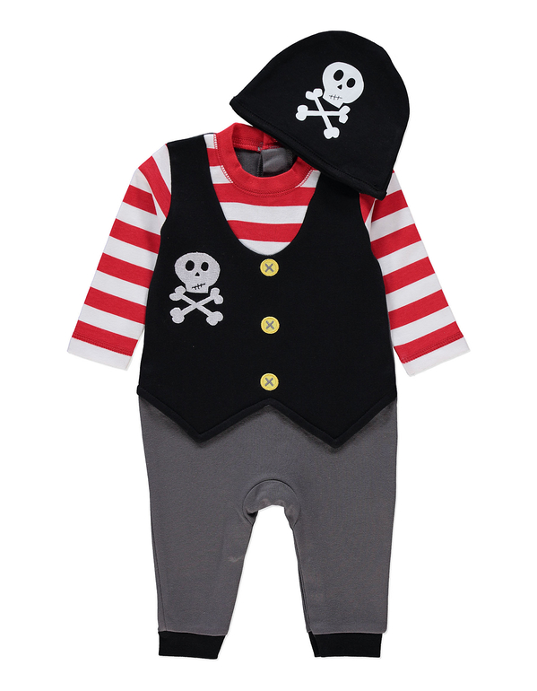 Комбинезончик+ шапочка Пират фирмы George. Слитный, сделан в виде кофточки, жилета с черепом и пуговицами и штанишек. Внизу расстегивается-застегивается на кнопках. + шапочка с черепом.Состав 100% хлопок. размеры