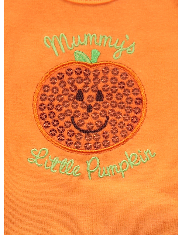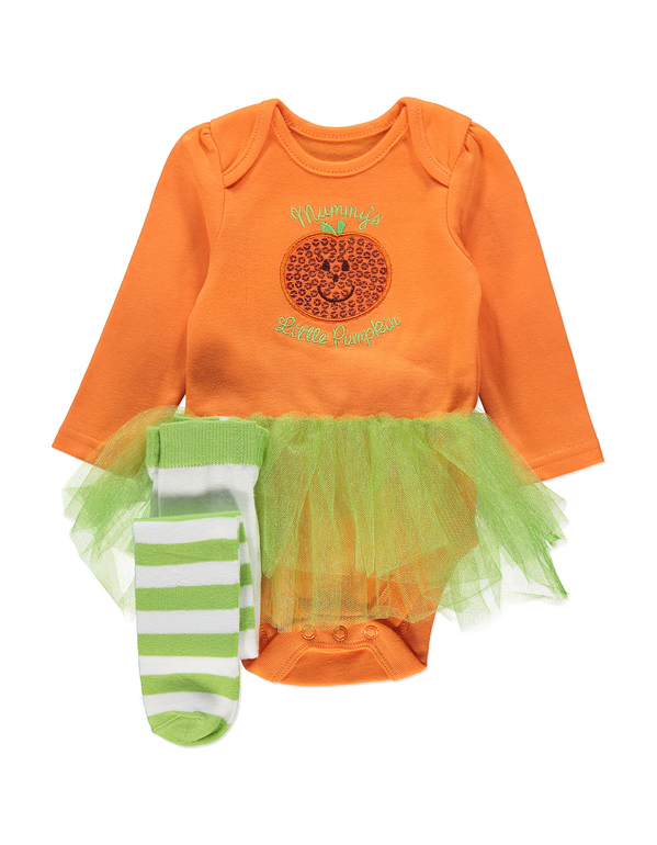 Комплект для девочки фирмы George. Ярко-оранжевый бодик с сетчатой юбочкой , впереди вышивка пайетками Тыковка + колготочки белые с салатовыми полосками. Состав 100% хлопок боди, колготки 79% хлопок, размер 9-12мес (74-80), 690руб.