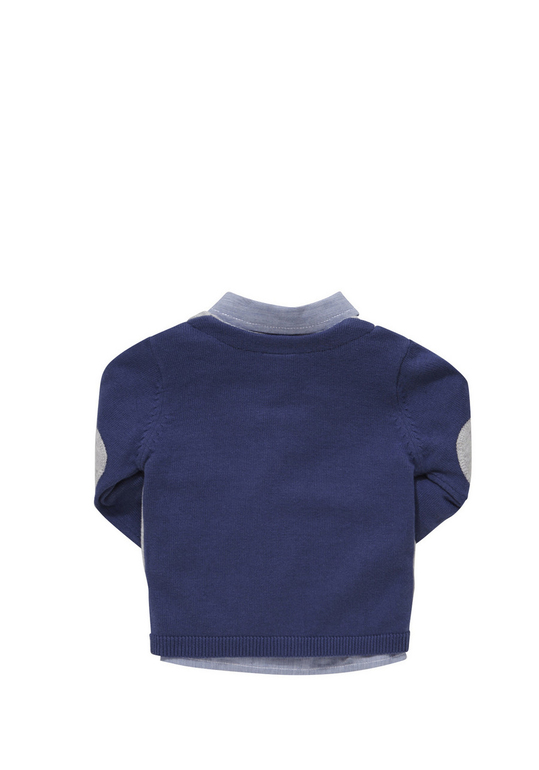 Комплект рубашка с длинным рукавом и кардиган фирмы F&F. Рубашка синяя+ белая полоска, кардиган вязаный, цвет серый с синим, застежка-пуговички, кармашки-обманки, декоративные заплатки на локтях. Состав 100% хлопок. Размер 12-18мес (80-86). 990руб.