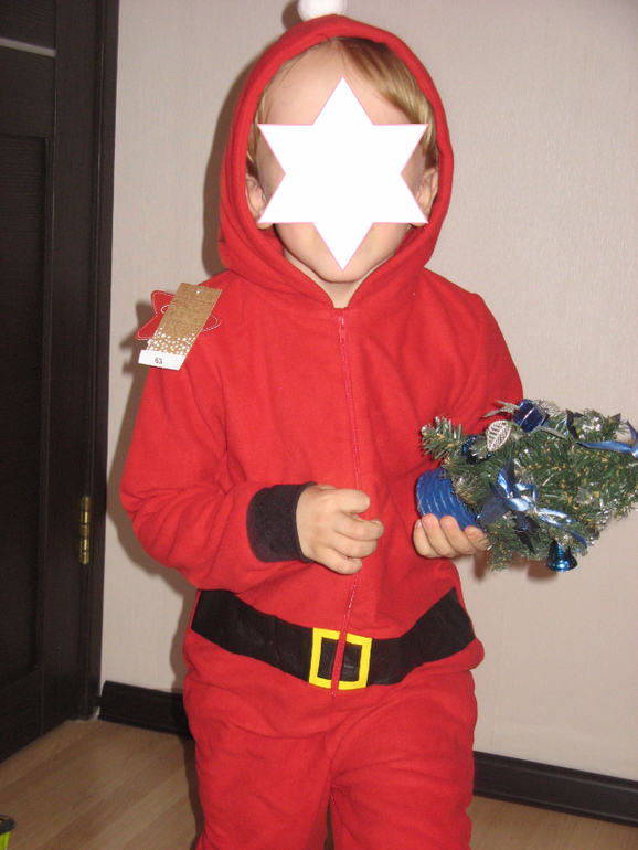Костюм Санта-мальчик фирмы Matalan. Слитный костюм с капюшоном - колпачком. Впереди застежка-молния. размер 4-5л(104-110), 6-7л(116-122) 990руб