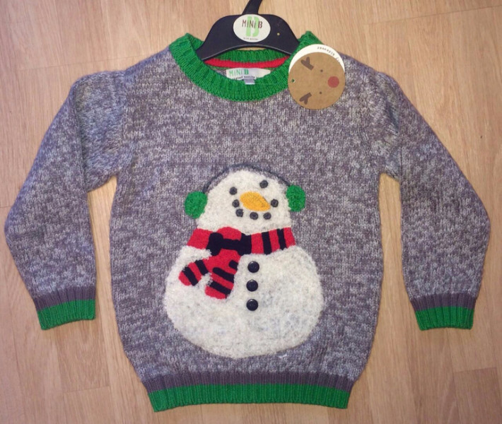 Кофточка новогодняя фирмы F&F. Темно-синяя с серыми рукавами, впереди рисунок снеговики и надписи. Состав 60% хлопок, 40% полиэстер, размер 5-6л (110-116), 6-7л(116-122) 590руб