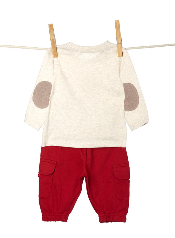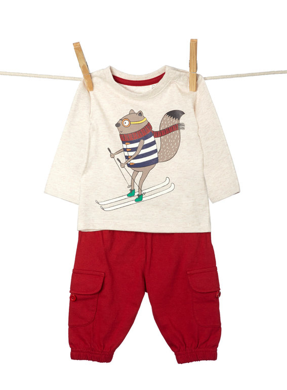 Комплект фирмы BHS. Бежевая кофточка, декоративные заплатки на локтях из вельвета, рисунок Белка впереди + брючки трикотаж на поясе-резинке, по бокам 2 кармашка, внизу на штанишках резиночки. Состав 100% хлопок брючки и 48% хлопок, 52% полиэстер кофточка. . Размер 3-6мес(62-68), 750руб.