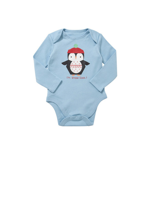 Бодик с длинным рукавом фирмы F&F. Голубой с пингвином впереди. 3-6мес(62-68), 6-9мес(68-74), 9-12мес (74-80), 12-18мес(80-86)