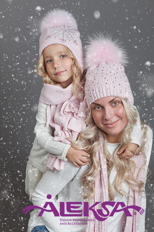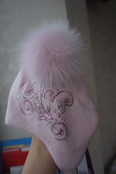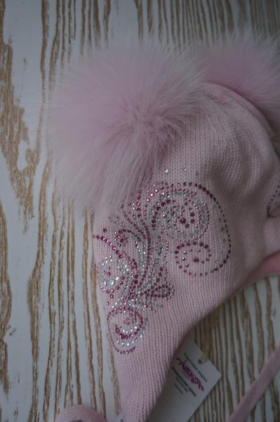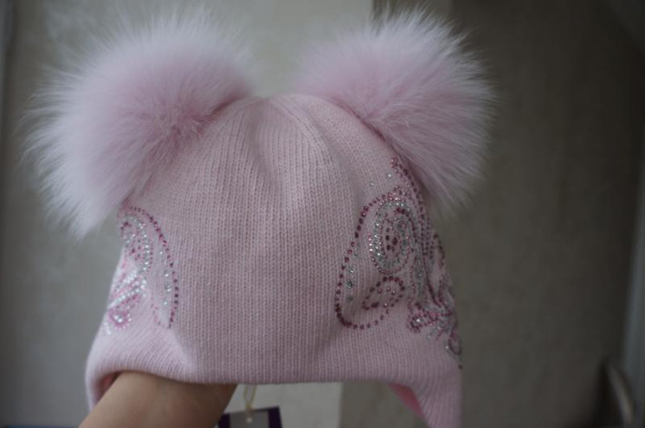Нежно-нежно розовая шапочка Aleksa, очень теплая, настоящая зима, но не черезчур жаркая,на ушках мембрана от ветра, внутри мягкая хлопковая подкладка. Цвет как на фото на моделях. Помпоны хорошие, пушистые, на кнопках