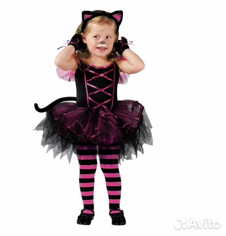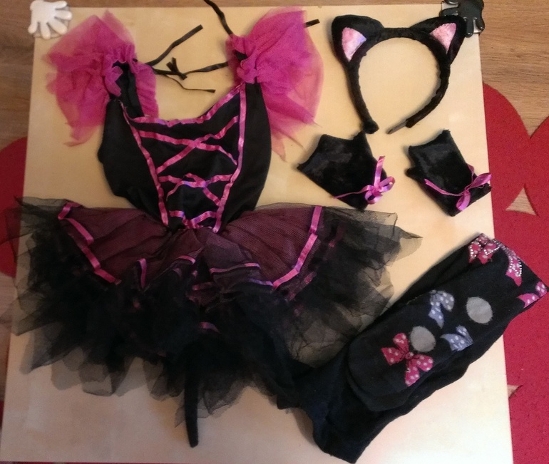 в комплекте платье, ушки, перчатки, хвостик и колготки (не как на фото, другие, подходящие по цвету, полосатых не было в комплекте