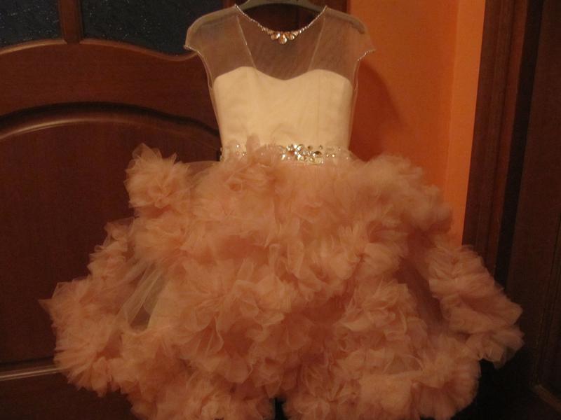 Очень пышное, красивое платье, в наличии цвет пудра, сзади на корсете, стразы пришиты в ручную, размер 26 (полуобхват груди 26см), есть длина от подмышки 53см и длина от подмышки 75см