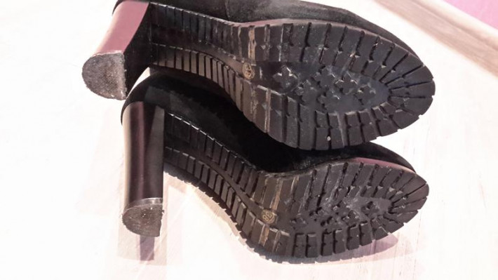 Продаю практически новые замшевые сапоги черного цвета. Снаружи натур замша, внутри натур мех. Обувала несколько раз, поэтому состояние идеальное: каблуки не сбиты, молнии работают, заломов на сгибах нет, мех внутри не примят. Высота каблука 10см минус 2см скрытая платформа, остается 8см