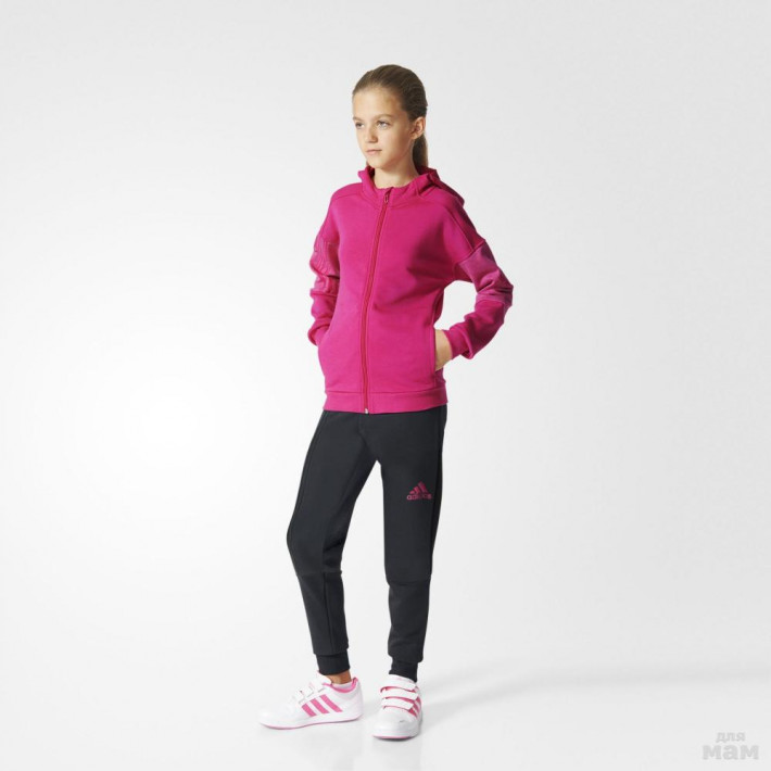 1. Детский спортивный костюм Adidas Separates, артикул AJ6517. Мягкий и удобный костюм,в котором можно не только заниматься спортом, но и надевать его на ежедневные прогулки. Яркая розовая худи, имеет приталенный крой и оборудована капюшоном. Рифленые манжеты и пояс уберегут от холода и надежно зафиксируют худи. Брюки, данного костюма, имеют зауженный к низу крой, но благодаря эластичной ткани, не стесняют движений. За идеальную посадку по фигуре, отвечает рифленый пояс на завязках, и широкие манжеты.