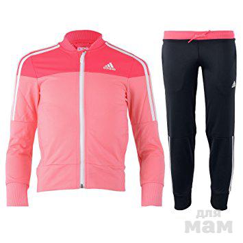 9)Детский спортивній костюм ADIDAS Yg S Pes Kids, артикул AB3111, это стильная и современная одежда для вашего ребенка, которая подарит приятные ощущения при занятиях спортом или повседневном ношении. Элегантный женский дизайн обеспечит хорошее настроение на весь день. Костюм состоит из олимпийки и брюк, изготовленных из плотной трикотажной ткани. Олимпийка выполнена в розовых тонах и оснащена молнией по всей длине и карманами для рук. Черные брюки имеют эластичный пояс на завязках и зауженный к низу крой, который не стесняет движений. Модель украшена фирменным логотипом ADIDAS и традиционными тремя полосками