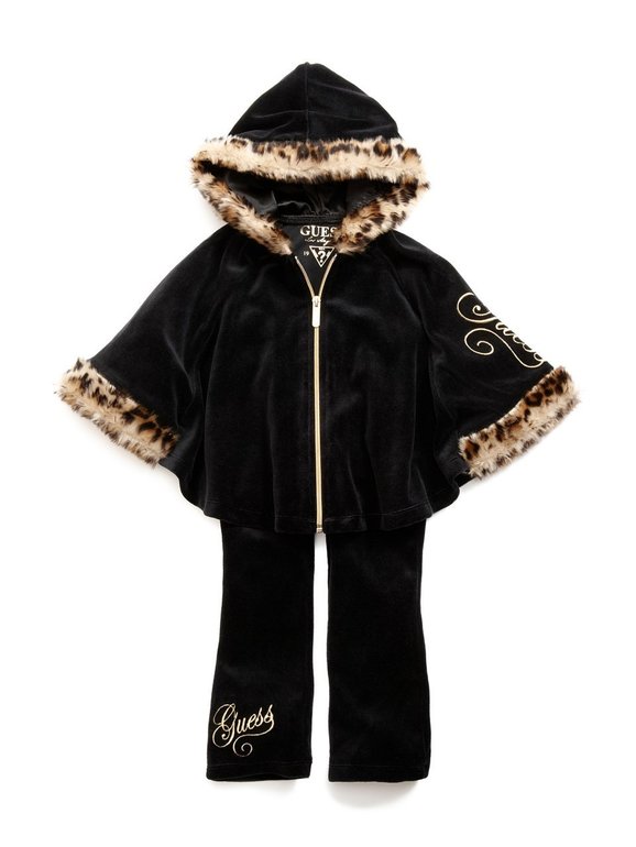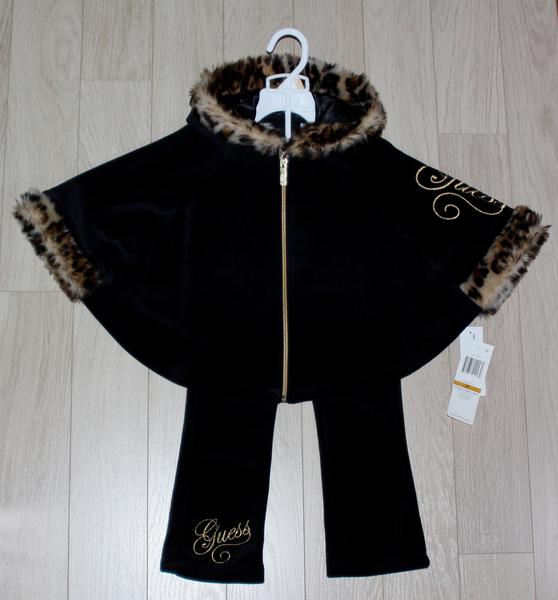 Пристрою шикарный велюровый комплект GUESS р.3 года. Оригинал, заказывала из Америки. Двойка: пончо и брючки. На капюшоне и рукавах оторочка мехом под леопарда - один из трендов сезона. Шикарная вышивка золотыми нитками на рукаве и брючине. Комплект стоил 59дол, отдаю по старому курсу.